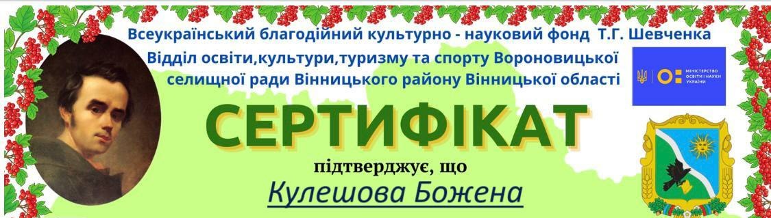 Вітаємо Божену КУЛЕШОВУ з отриманням сертифіката учасника V Всеукраїнського Інтернет-флешмобу “Ми нащадки Кобзаря”, присвяченого 211-й річниці від дня народження Тараса Шевченка! Особливо цінно, що цей сертифікат підписаний праправнучкою Тараса Григоровича по сестрі Катерині – Людмилою КРАСИЦЬКОЮ. Це ще раз підкреслює важливість збереження і популяризації спадщини...