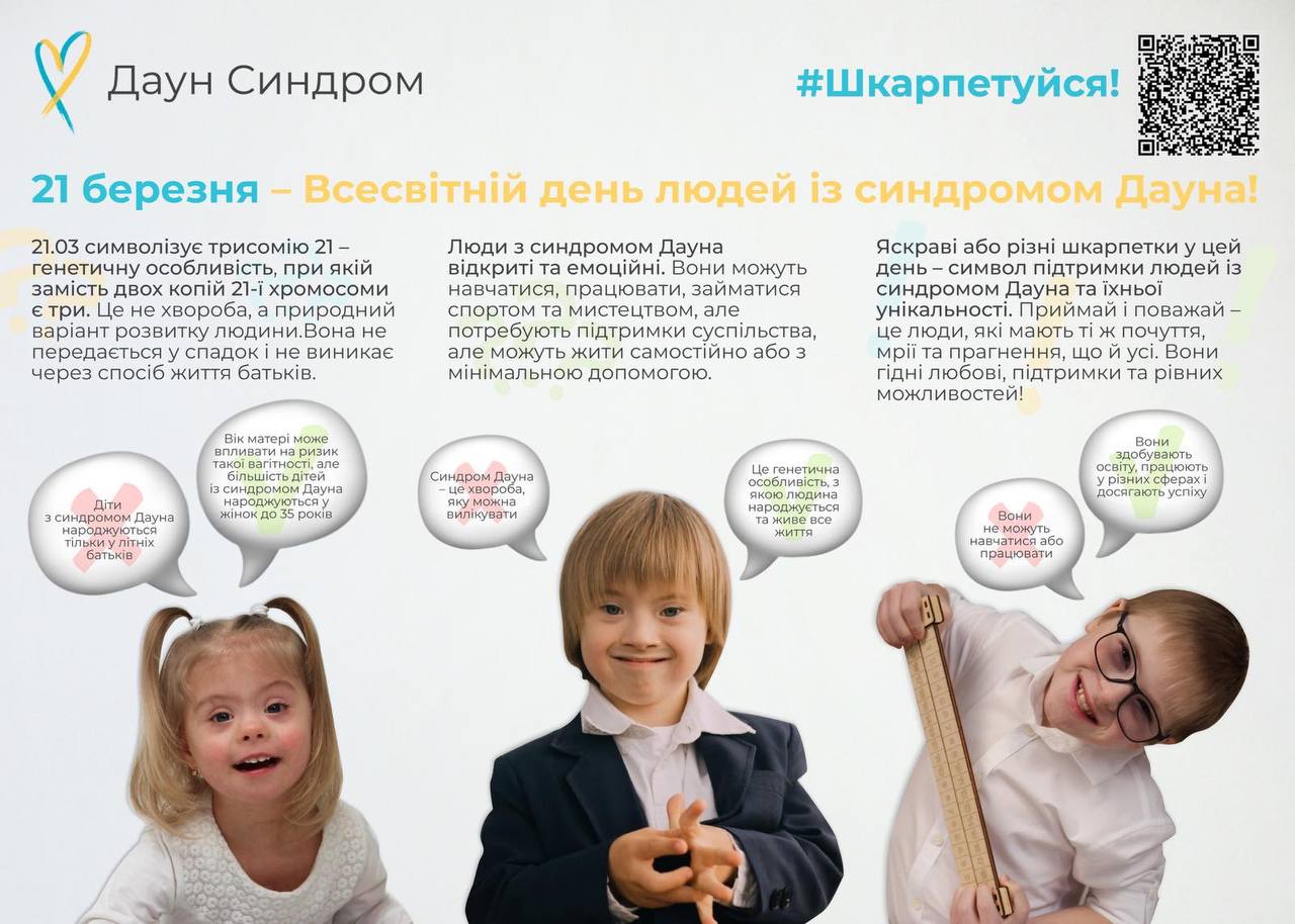 ✅ Взяти участь у всесвітній акції «Lots of socks» (Шкарпетуйся!) – надягнути яскраві, непарні шкарпетки, що символізують додаткову хромосому.