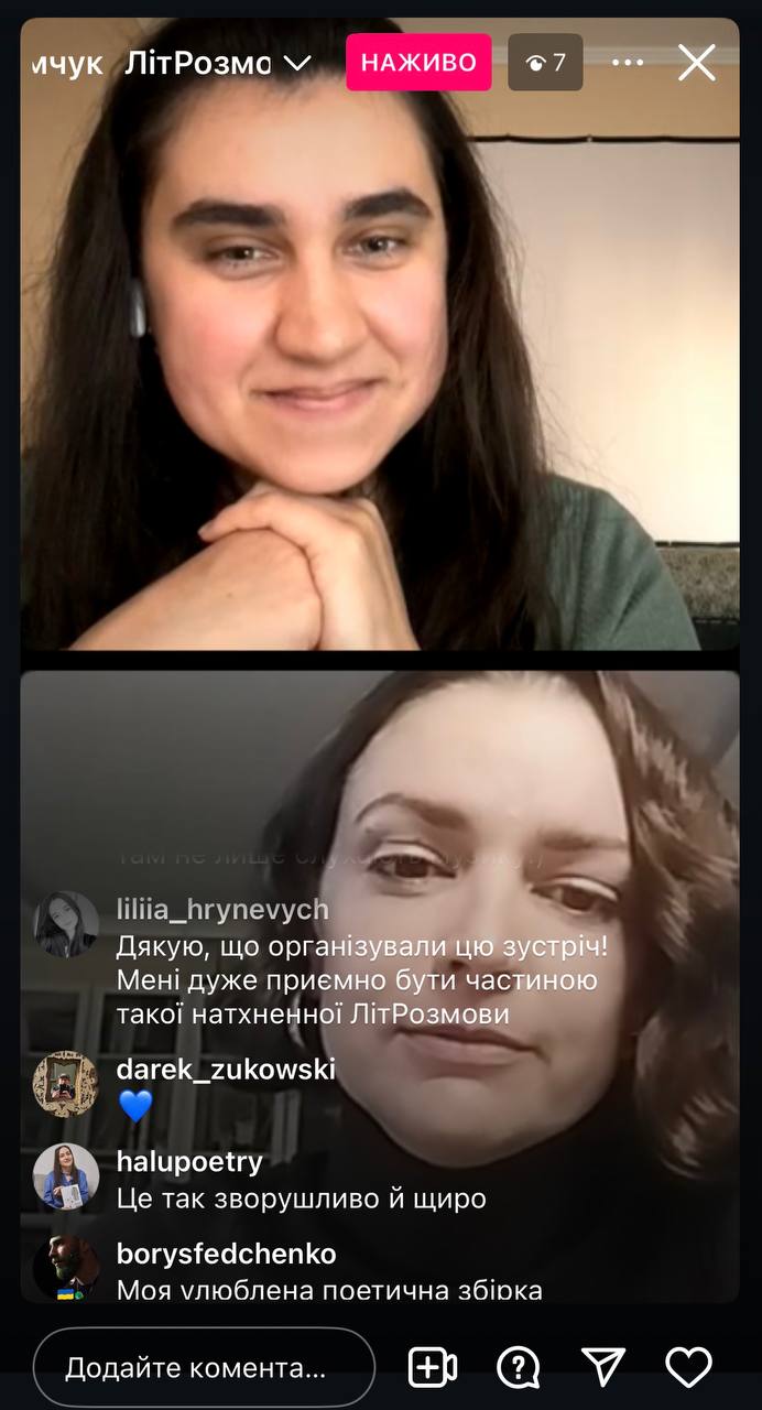 Сьогодні, у Всесвітній день поезії, наша здобувачка освіти Лілія ГРИНЕВИЧ долучилася до ЛітРозмови в прямому етері в Instagram на сторінці Луганської обласної універсальної наукової бібліотеки, де мала змогу поспілкуватися з відомою поетесою, сценаристкою та культурною менеджеркою Любов’ю ЯКИМЧУК.