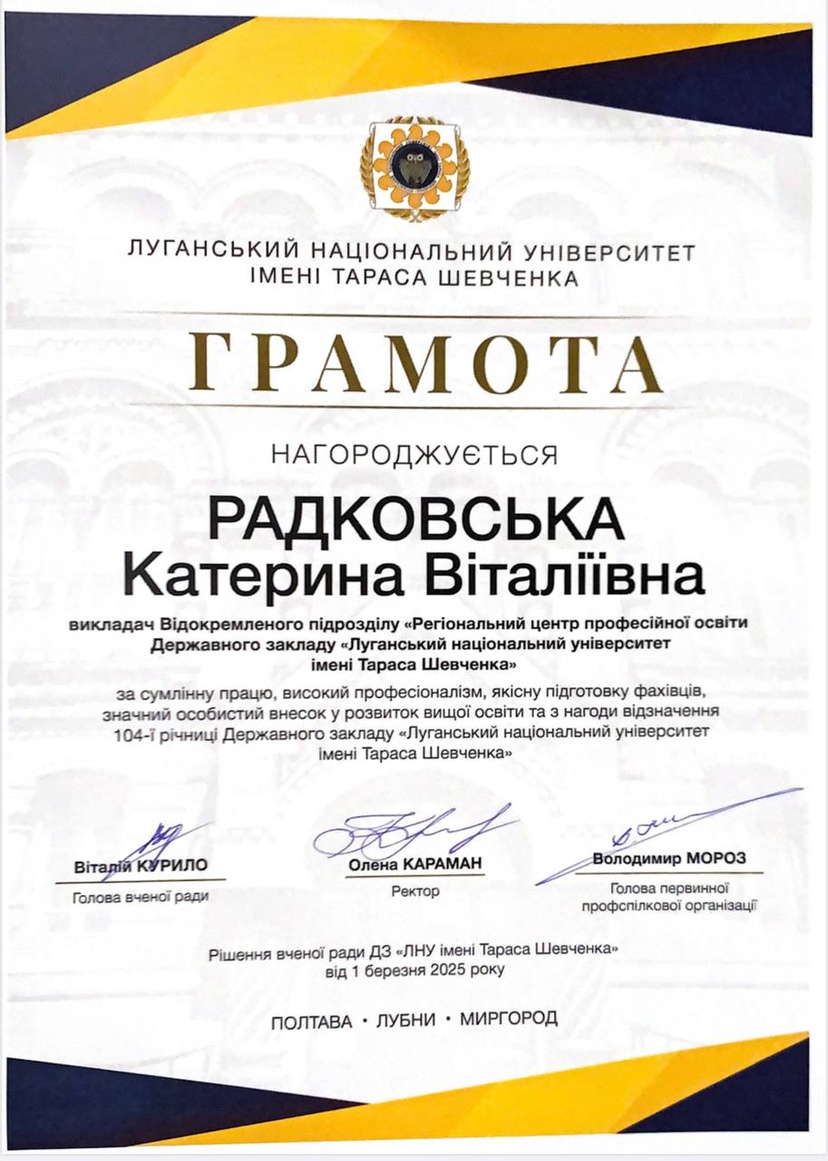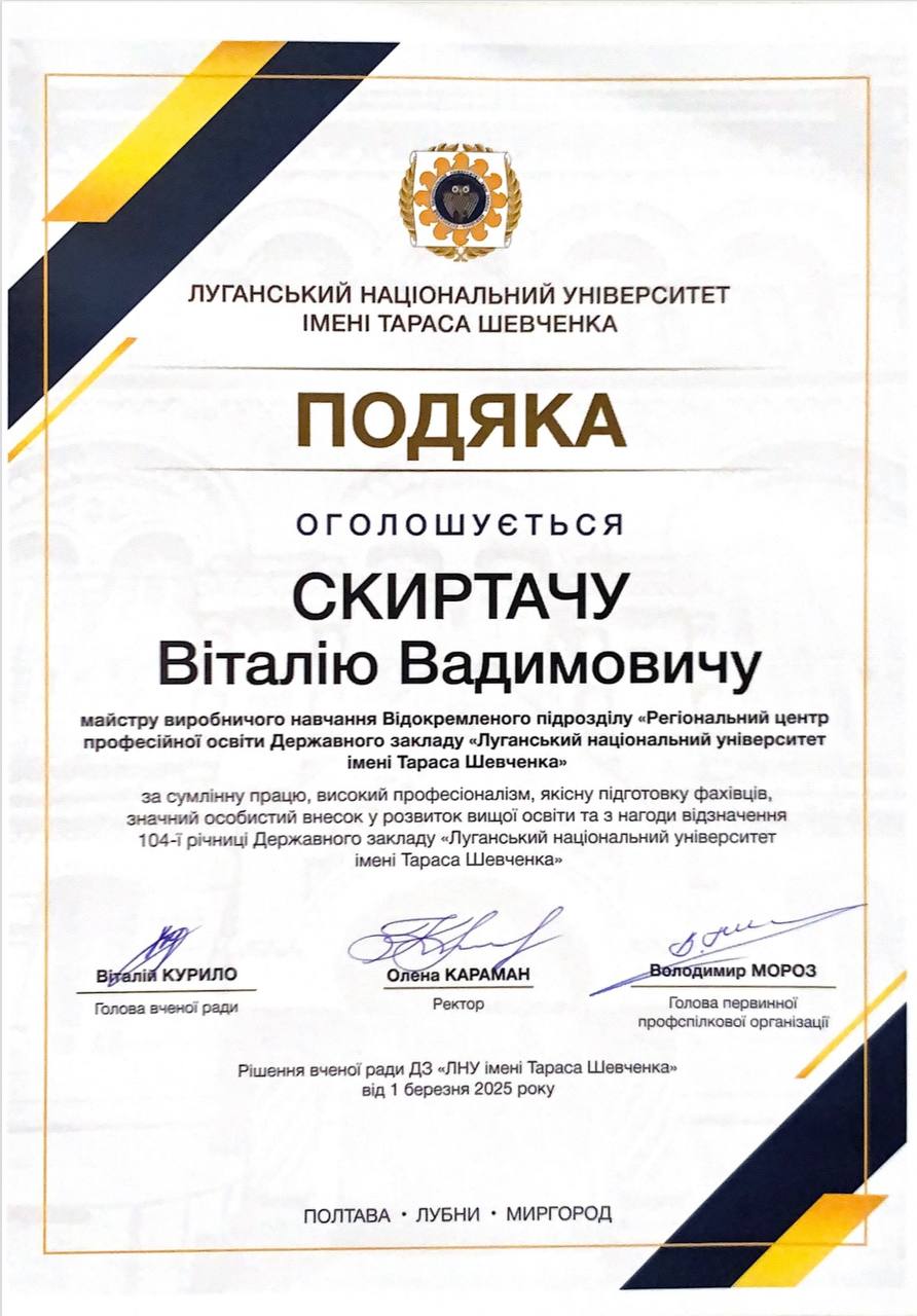 З нагоди 104-ї річниці ДЗ «Луганський національний університет імені Тараса Шевченка» наші педагоги Віталій СКИРТАЧ і Катерина РАДКОВСЬКА отримали почесні відзнаки за сумлінну працю, професіоналізм та внесок у розвиток освіти!