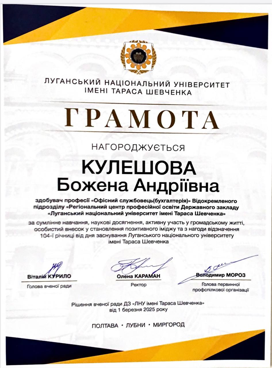 Наша здобувачка освіти Божена КУЛЕШОВА отримала почесну грамоту від Луганського національного університету імені Тараса Шевченка. Відзначення відбулося з нагоди 104-ї річниці заснування університету та стало визнанням її сумлінного навчання й активної громадської діяльності.