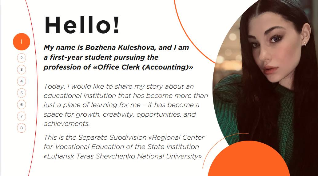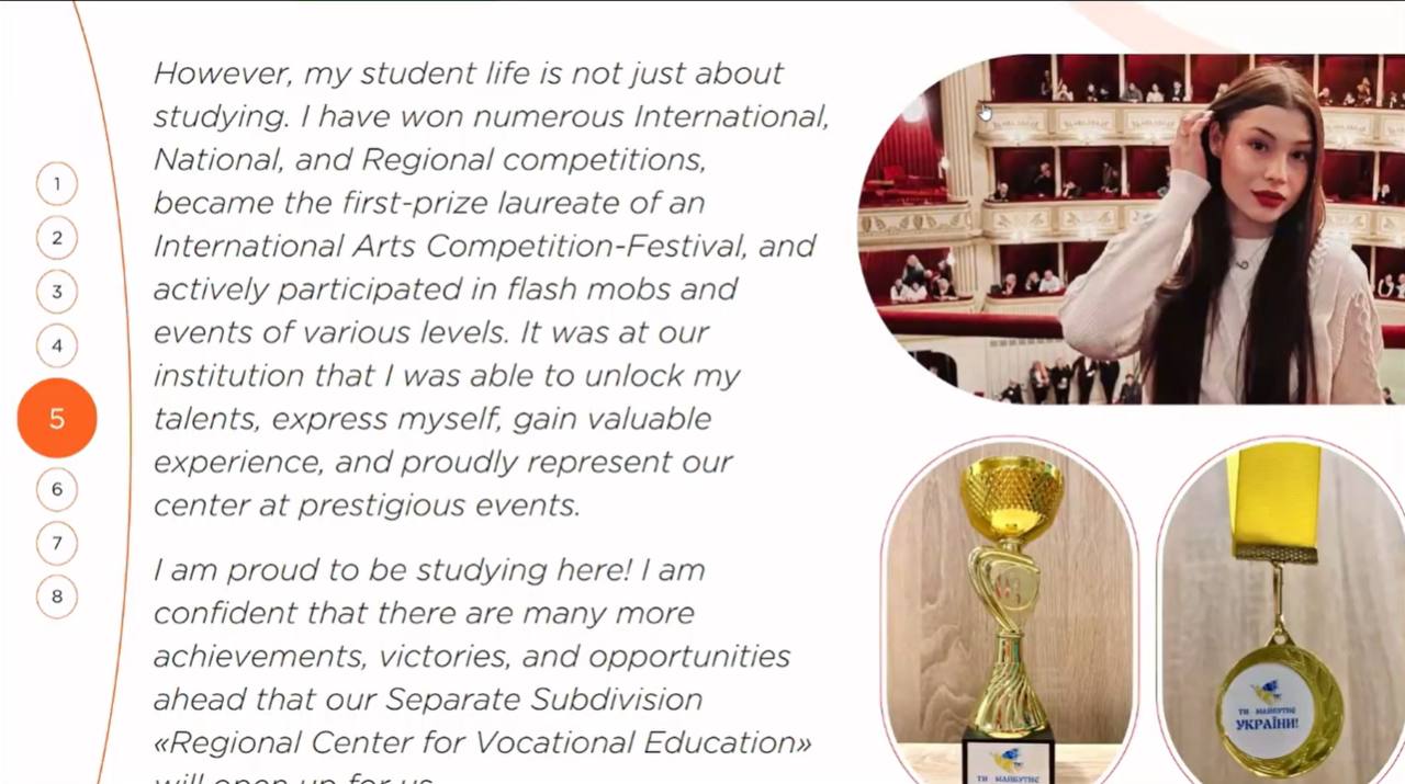 Вітаємо нашу талановиту здобувачку освіти Божену КУЛЕШОВУ, яка стала єдиною представницею від закладів ЗП(ПТ)О Луганської області у Всеукраїнському англомовному усному журналі «Моя історія…» / The Speaking Journal «My story…», що проходить 9–10 квітня 2025 року.