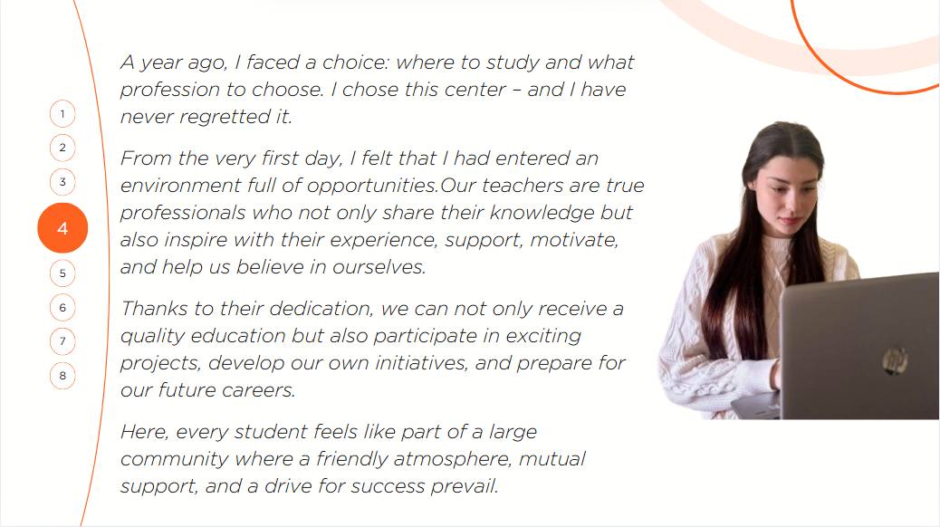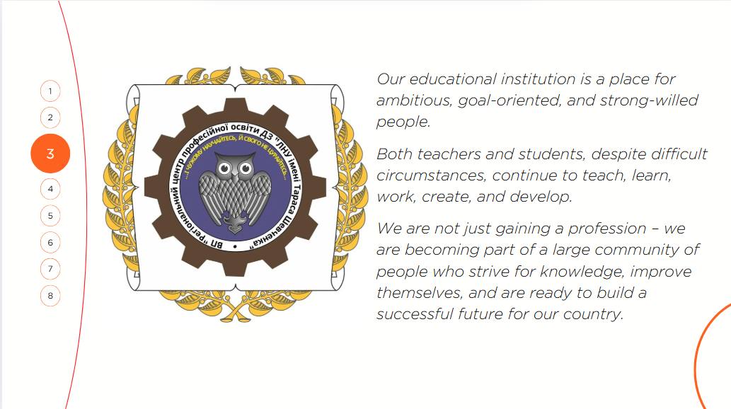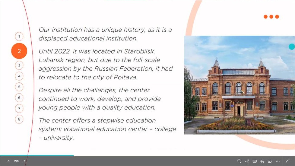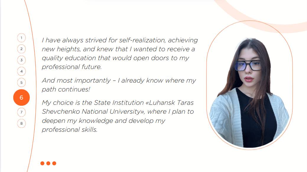 У своєму виступі Божена презентувала історію про наш Відокремлений підрозділ «Регіональний центр професійної освіти» Державного закладу «Луганський національний університет імені Тараса Шевченка» — переміщений, але незламний заклад, де панує дух підтримки, розвитку та віри в майбутнє. Вона поділилася тим, чим став для неї Центр: не лише місцем навчання, а простором розвитку, самореалізації, віри в себе.