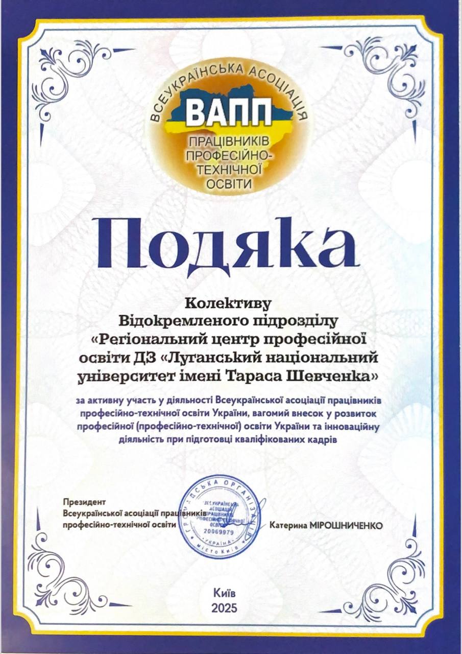 Наш Відокремлений підрозділ «Регіональний центр професійної освіти Державного закладу «Луганський національний університет імені Тараса Шевченка» отримав ПОДЯКУ від ГО «Всеукраїнська асоціація працівників професійно-технічної освіти» з нагоди 30-річної діяльності ВАПП!💙💛