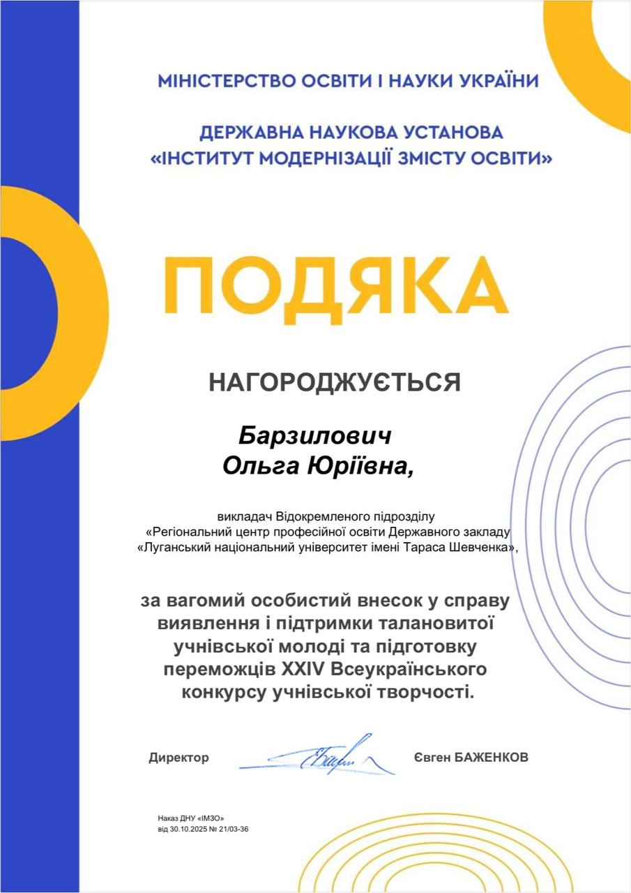 БАРЗИЛОВИЧ Ольга Юріївна, викладачка ВП «РЦПО ДЗ «Луганський національний університет імені Тараса Шевченка»,