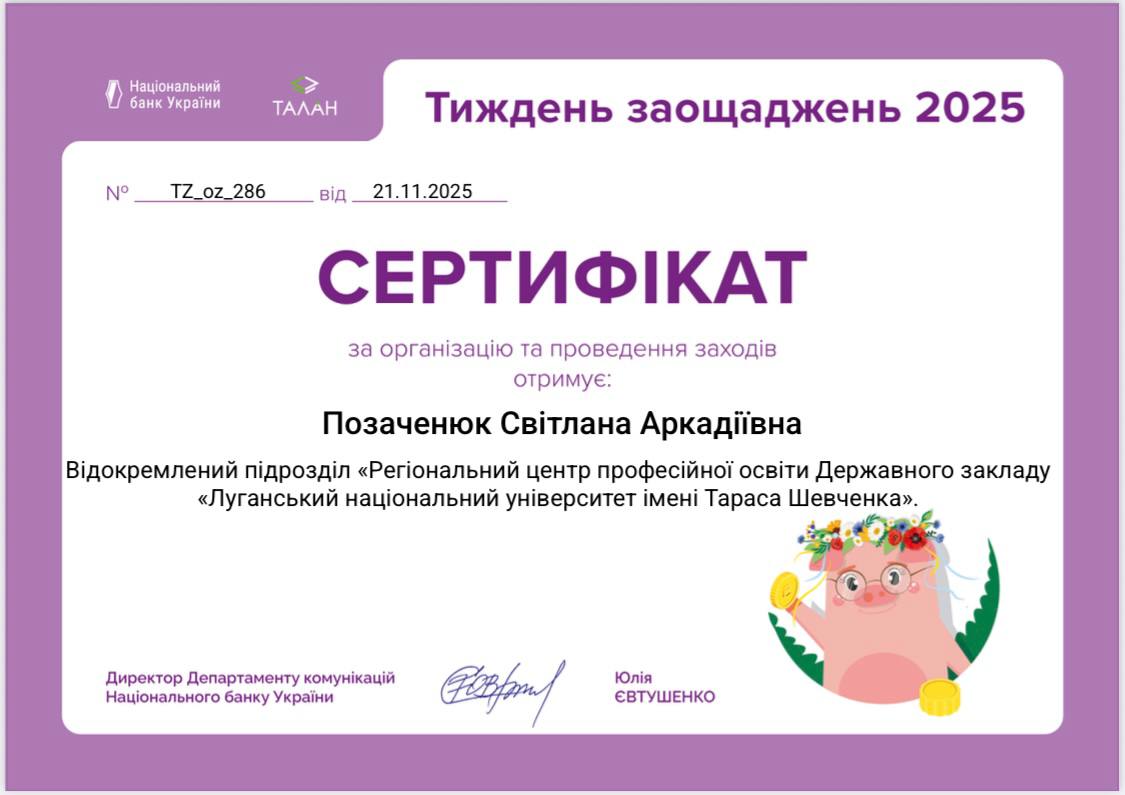 За активну участь, організацію та проведення заходів отримано сертифікат від Національного банку України та центру фінансових знань «ТАЛАН».