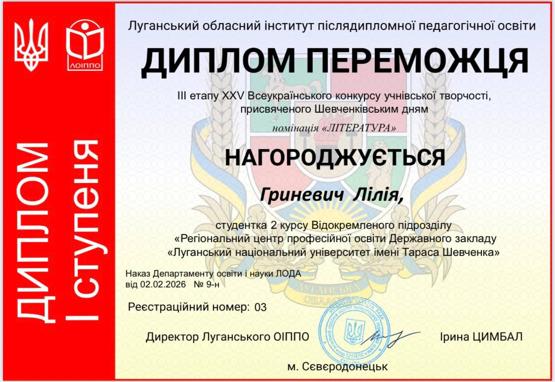 Щиро радіємо успіху нашої талановитої Лілії ГРИНЕВИЧ, яка здобула диплом І ступеня у ІІІ етапі ХХV Всеукраїнського конкурсу учнівської творчості, присвяченого Шевченківським дням, у номінації «Література, який проводив Луганський обласний інститут післядипломної педагогічної освіти.